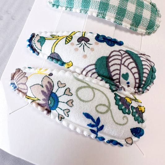 Dorothy Vintage Fabric Snap Hair Clips - Set of 6 - Teal & White