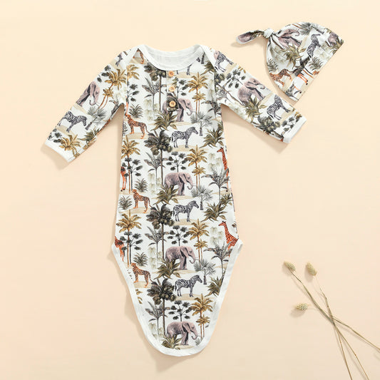 Jungle Safari Long Sleeve Knotted Baby Gown & Hat Set