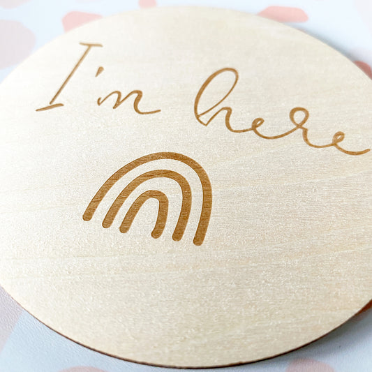 I'm Here Rainbow Wooden New Baby/Birth Announcement Disc