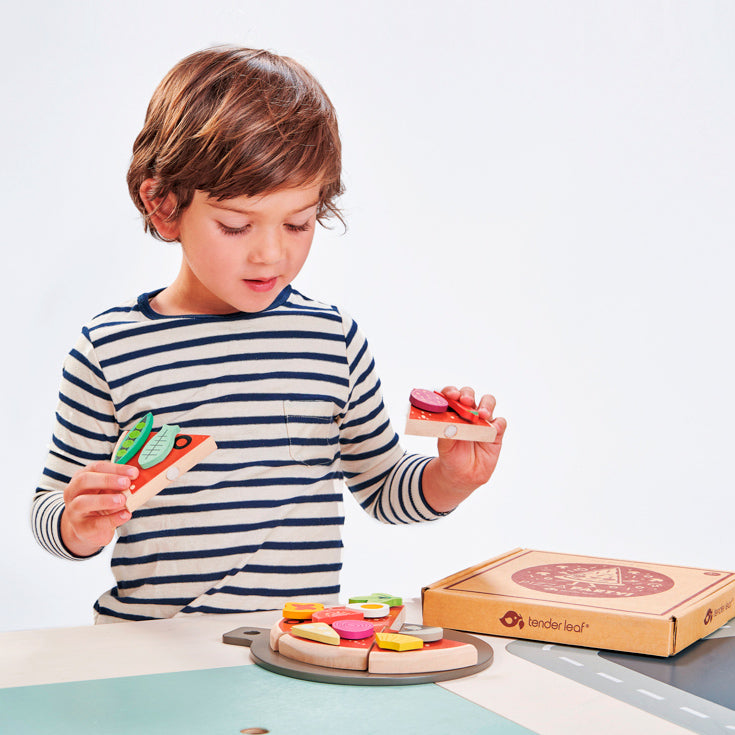 Now you can create your own delicious pizza for friends or yourself! Pre-cut into 6 slices and arranged on a rustic serving tray, have fun arranging 12 different toppings that are interchangeable and held in place by a small velcro spot.