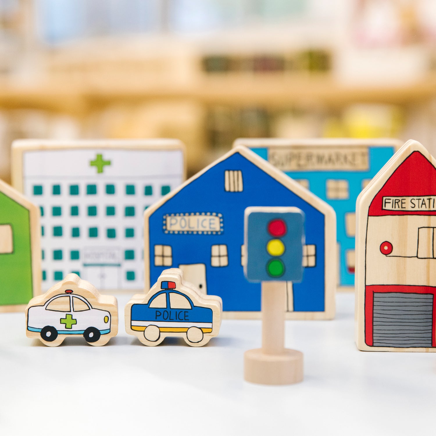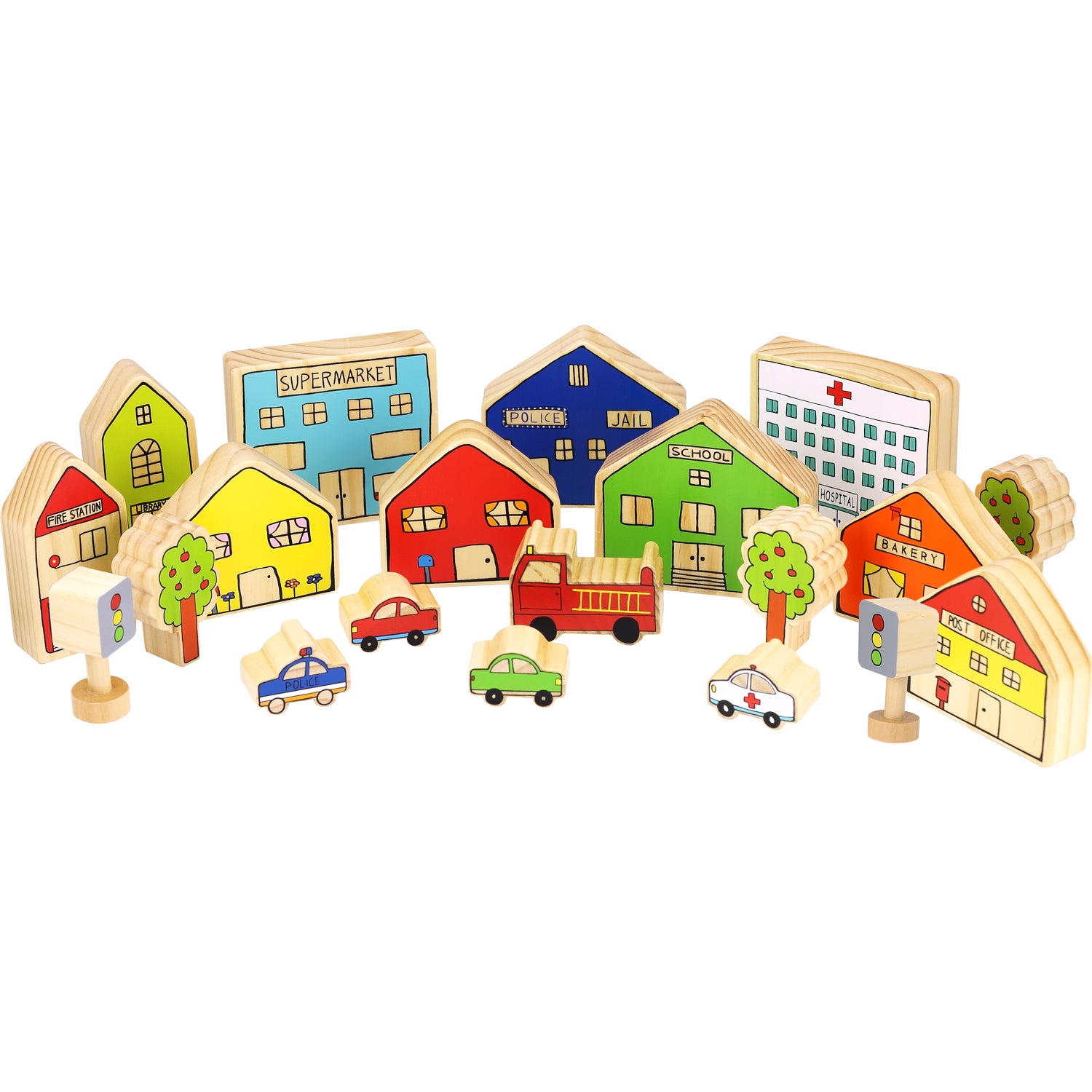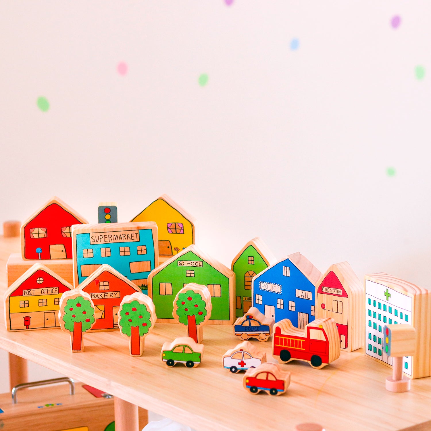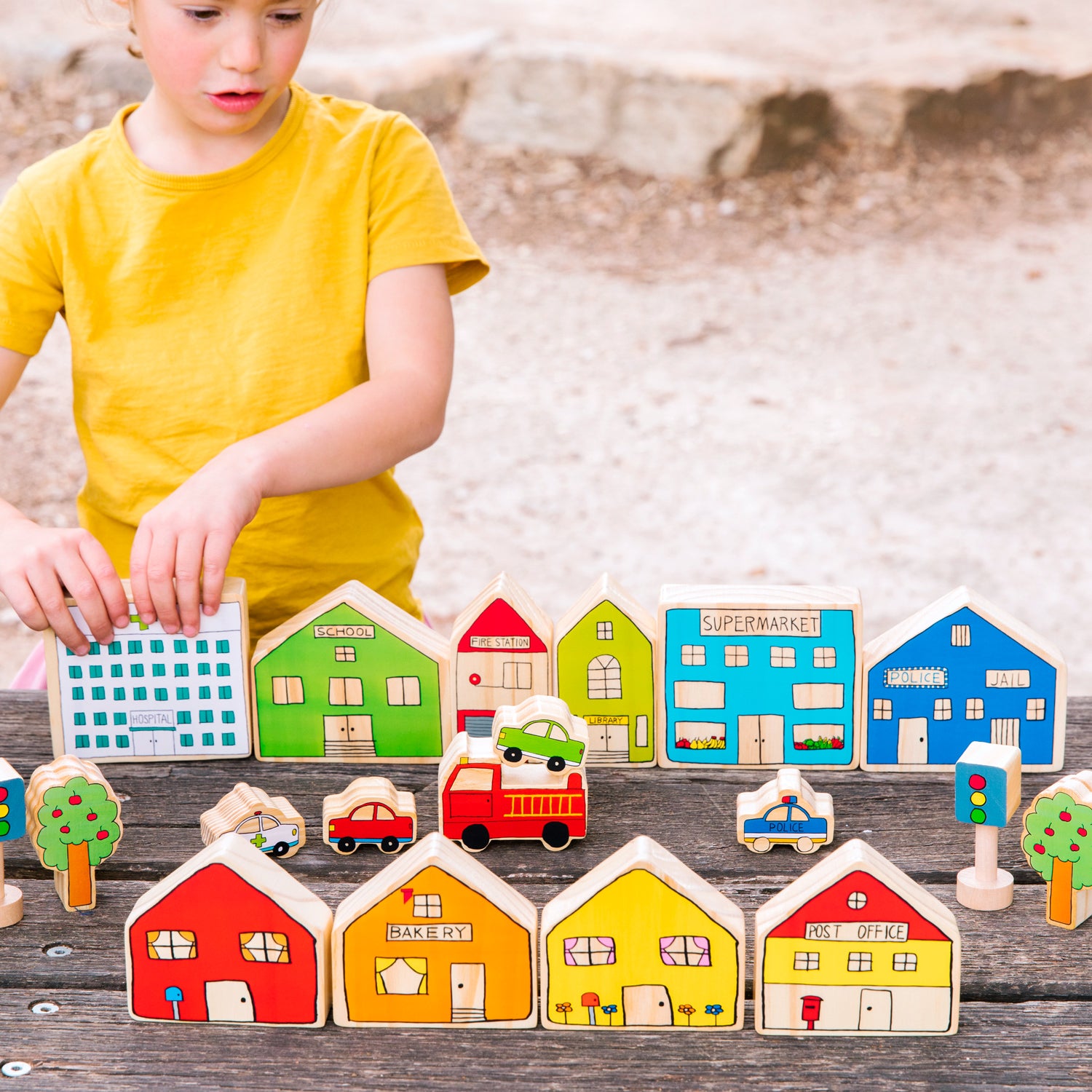 The Village encourages imaginative play and is a great set for lots of role-playing! This toy set includes 10 small buildings, trees, vehicles and traffic lights to make your own little town.