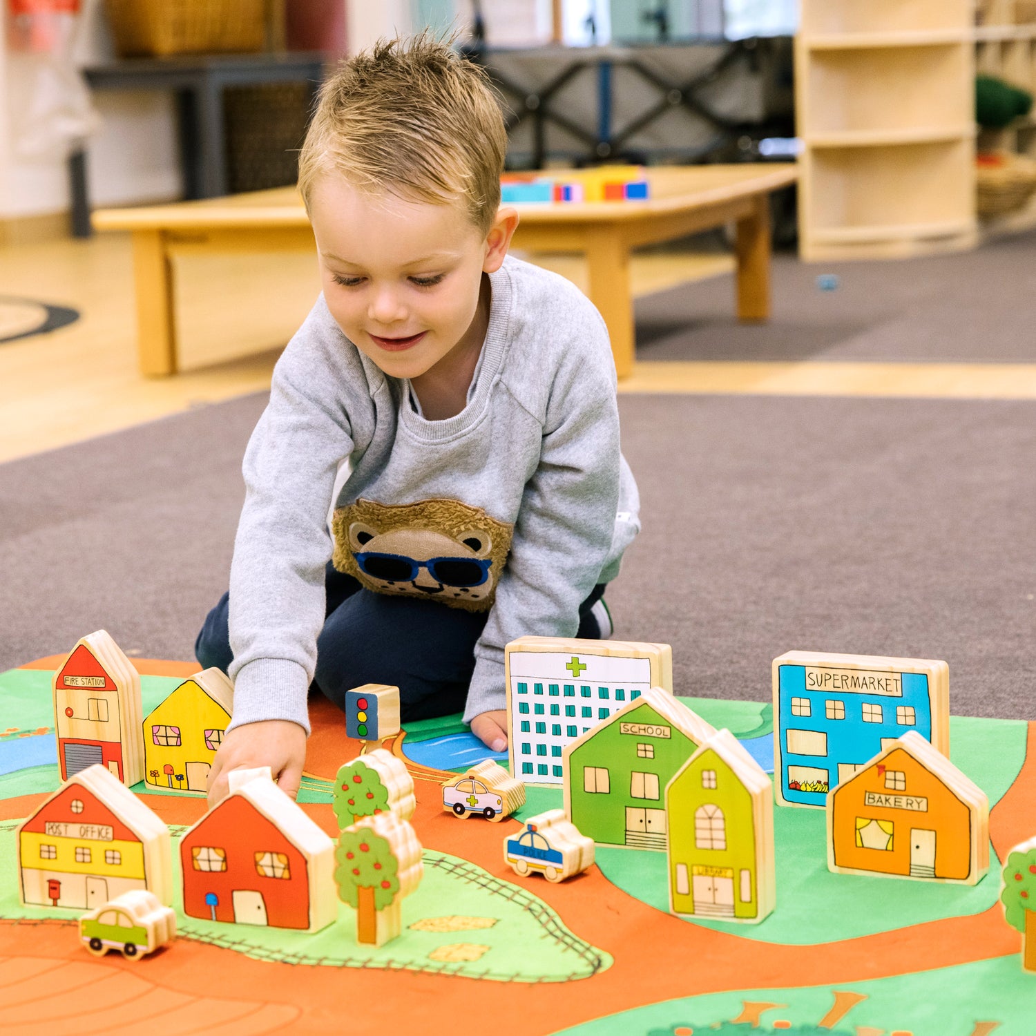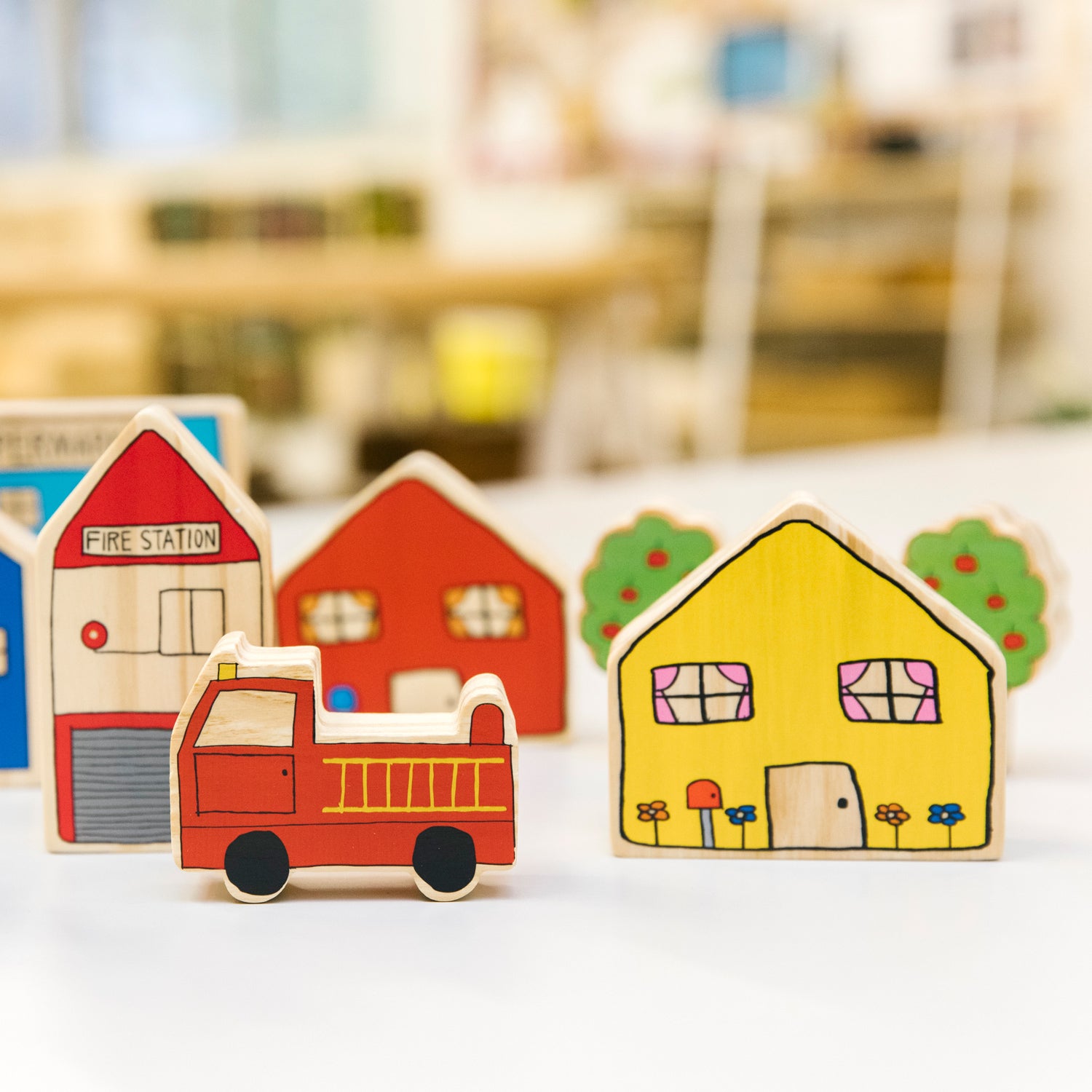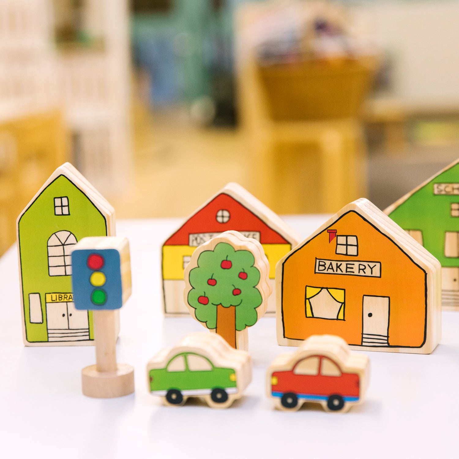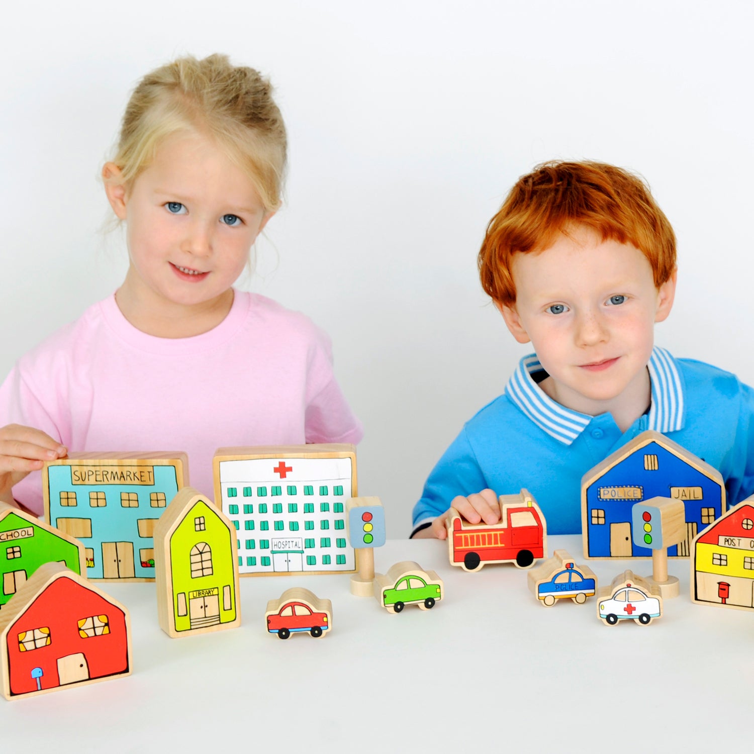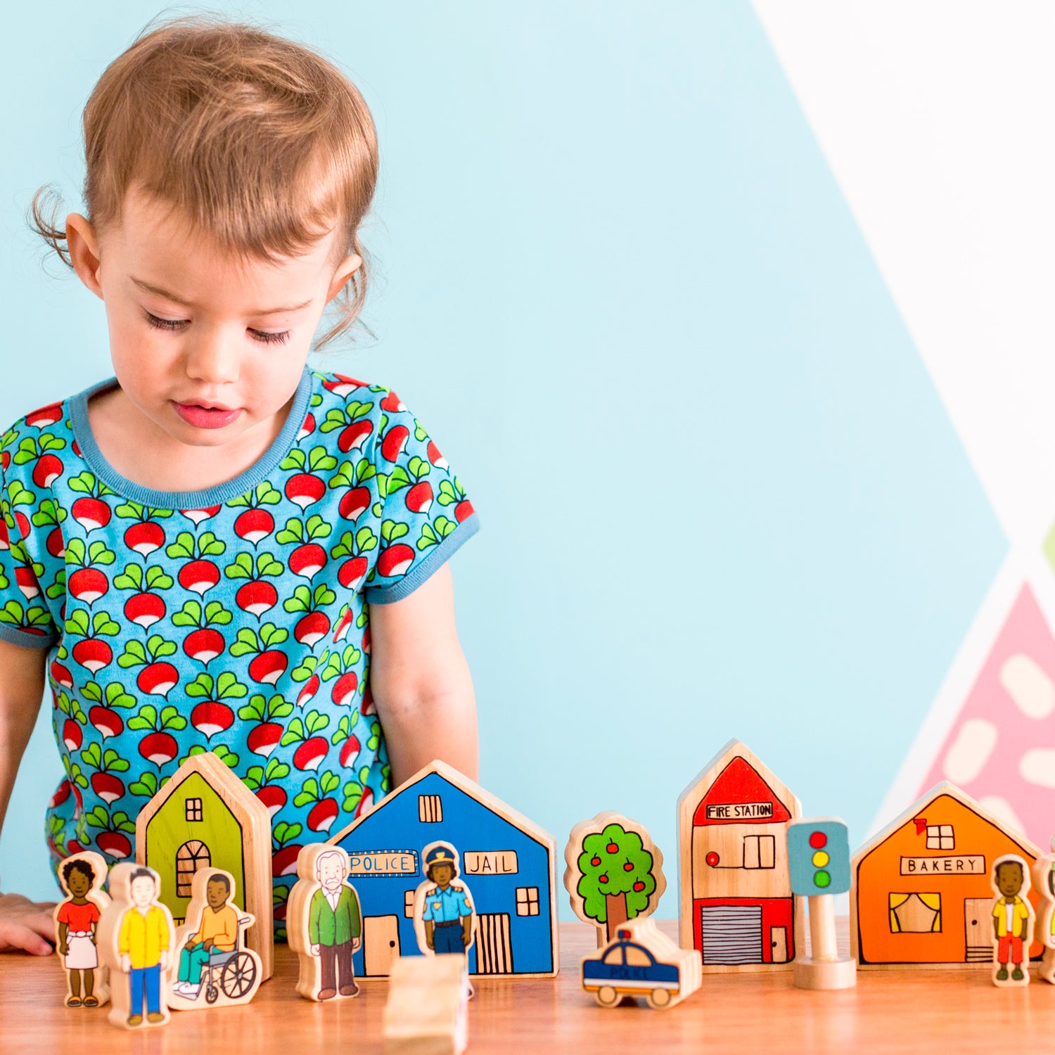The Village encourages imaginative play and is a great set for lots of role-playing! This toy set includes 10 small buildings, trees, vehicles and traffic lights to make your own little town.