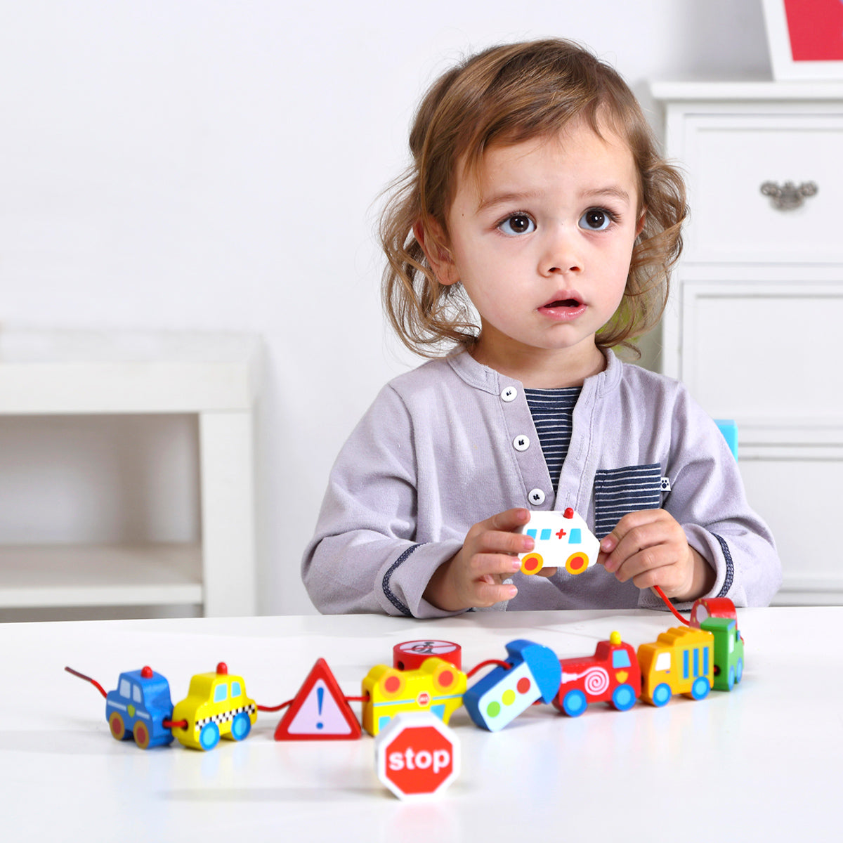 Your child will have fun learning to lace a thread through these cute transport blocks, building hand dexterity, hand-eye coordination and also developing concentration and focus.
